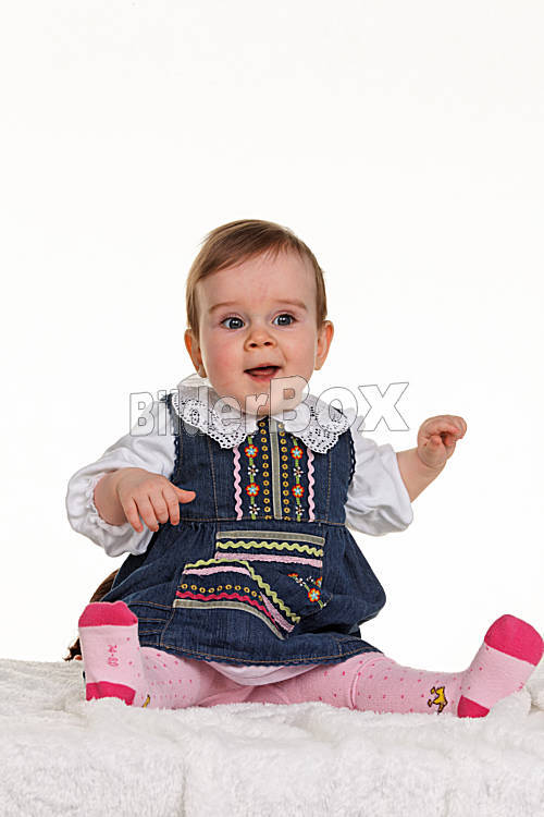 Beschreibung Kleines fröhliches Kind - Baby sitzt auf einer Decke