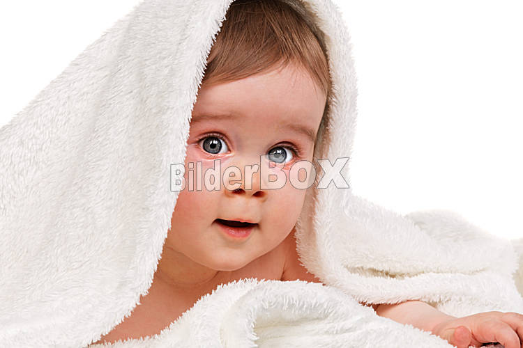 Beschreibung Kleines staunendes Kind Baby in Decke gewickelt