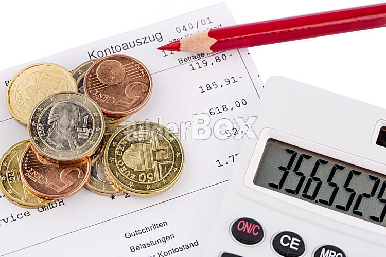 Beschreibung Der Kontoauszug einer Bank und einige Münzen der Euro Währung