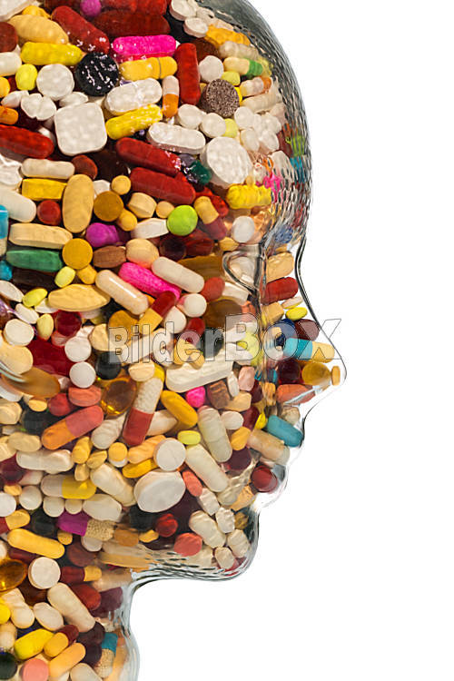 Kopf aus Glas mit Tabletten