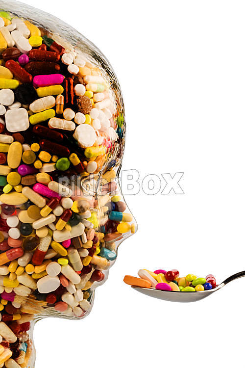 Beschreibung Ein Kopf aus Glas mit vielen Tabletten gefüllt. Symbolphoto für Medikamente, Mißbrauch und Tablettensucht.