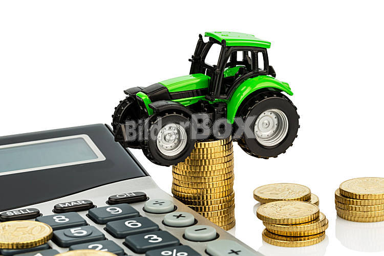 Beschreibung Bauern in der Landwirtschaft haben mit steigenden Kosten zu rechnen. Höhere Preise bei Futter, Dünger und Pflanzen. Traktor mit Münzen und Taschenrechner