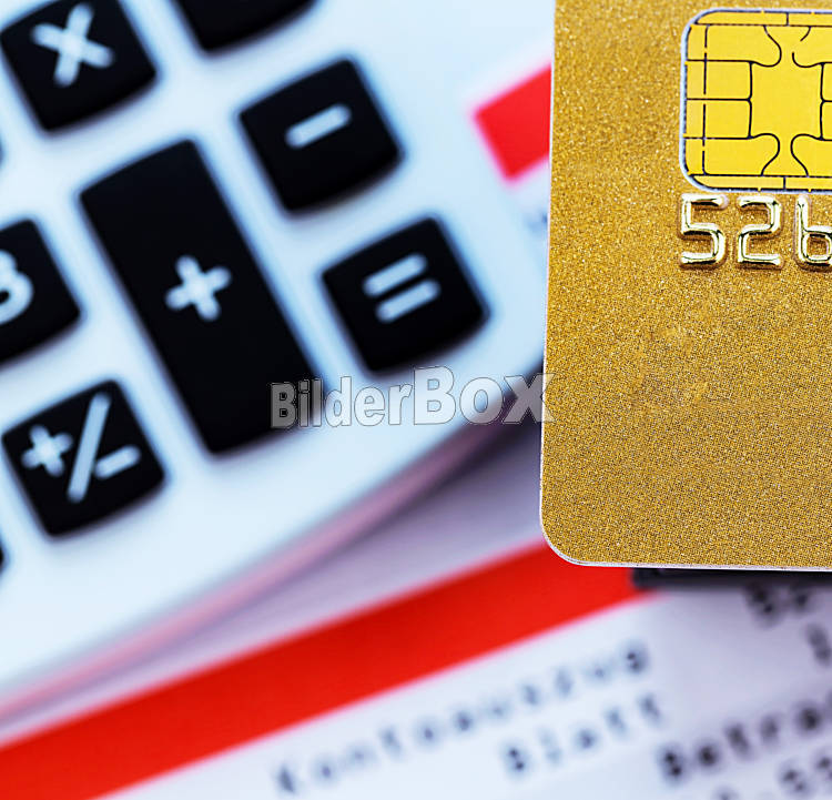 Kreditkarte, Kontoauszug und Taschenrechner