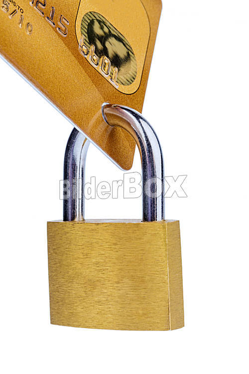 Beschreibung Eine goldene Kreditkarte und Vorhängeschloss. Symbolfoto für bargeldloses Einkaufen und Statussymbole.