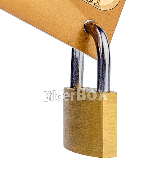 Beschreibung Eine goldene Kreditkarte und Vorhängeschloss. Symbolfoto für bargeldloses Einkaufen und Statussymbole.