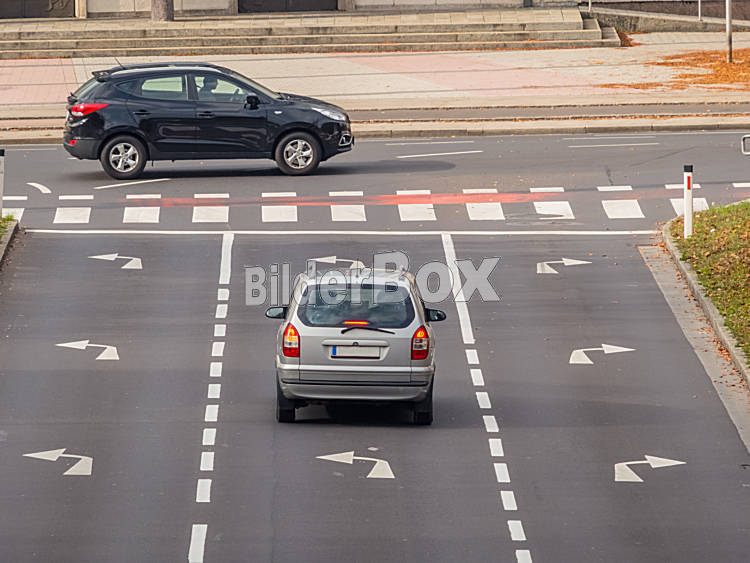 Beschreibung Die Kreuzung einer Strasse in der Stadt. Mit Leitlinien zum Abbiegen