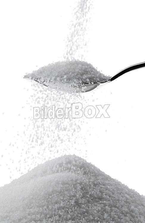 Beschreibung Feiner Kristall Zucker auf einem Löffel