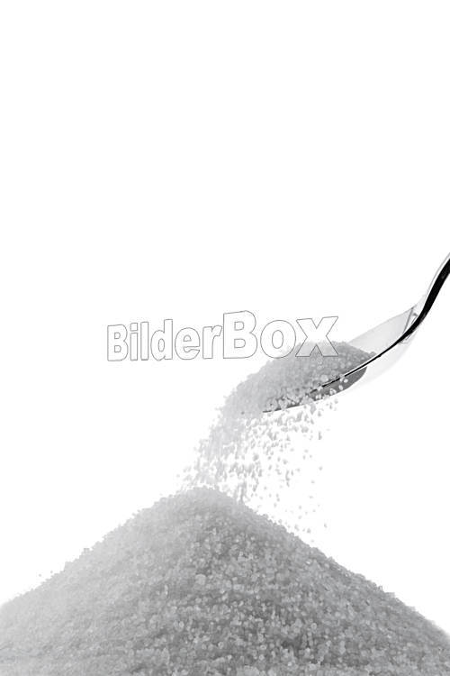 Beschreibung Feiner Kristall Zucker auf einem Löffel