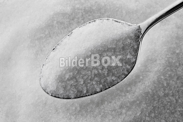 Beschreibung Feiner Kristall Zucker auf einem Löffel