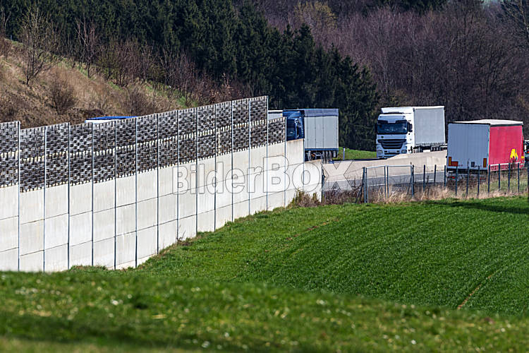 Beschreibung Eine Lärmschutzwand auf der Autobahn A1 in Österreich schützt die Anrainer gegen den Lärm von Autos und Lastwagen