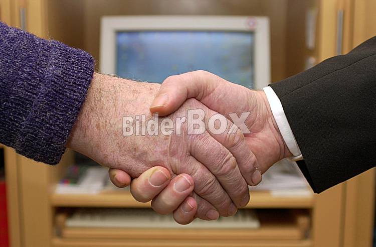 Beschreibung Haendedruck aelterer Arbeiter und Manager [ (c) www.BilderBox.com, Erwin Wodicka; A-4062 Breitbrunn, Tel: +43 676 5103 678; Verwendung nur gegen HONORAR, BELEG, URHEBERVERMERK und den AGBs auf...