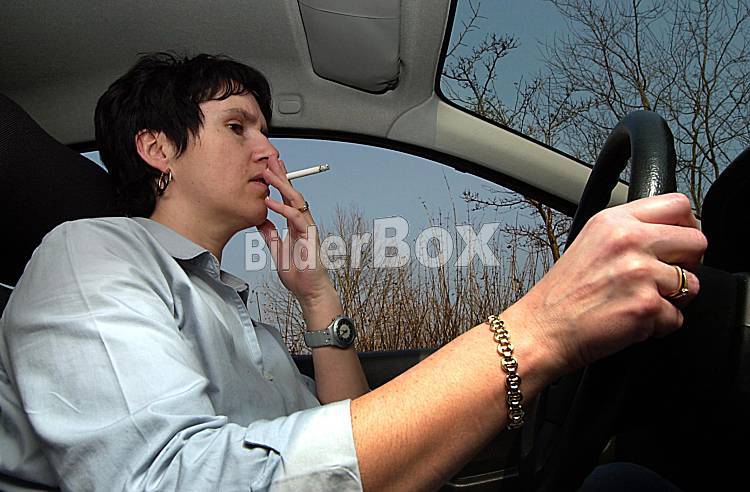 Beschreibung Frau raucht beim Autofahren eine Zigarette - [ (c) www.BilderBox.com, Erwin Wodicka; A-4062 Breitbrunn, Tel: +43 676 5103 678; Verwendung nur gegen HONORAR, BELEG, URHEBERVERMERK und den AGBs auf...