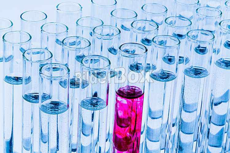 Beschreibung Viele Reagenzgläser bei einem Versuch in einem Forschungslabor einer Universität. Symbolfoto für lernen und forschen.