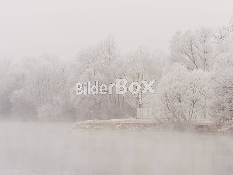 Beschreibung Landschaft mit Bäumen und Raureif bei Kälte im Winter. Typisches Winterbild als Hintergrund.
