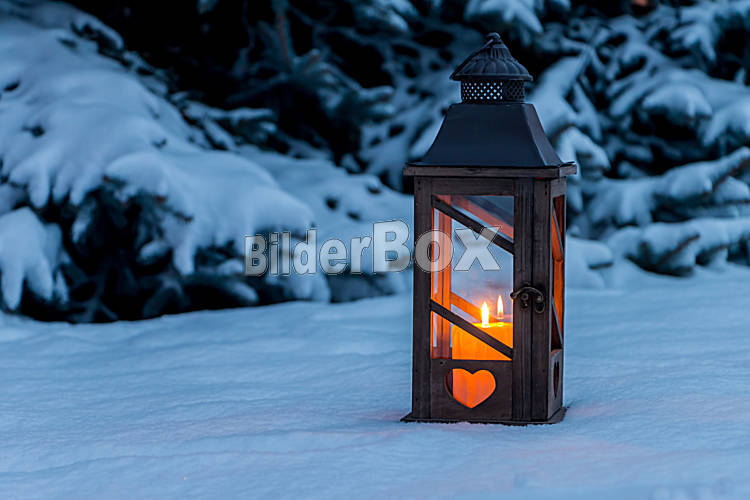 Beschreibung Eine Laterne leuchtet im Schnee zu Weihnachten. Romantisches Licht an einem Abend im Winter. Stille und Ruhe