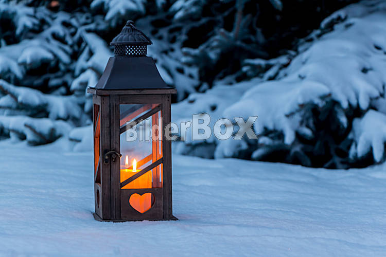 Beschreibung Eine Laterne leuchtet im Schnee zu Weihnachten. Romantisches Licht an einem Abend im Winter. Stille und Ruhe