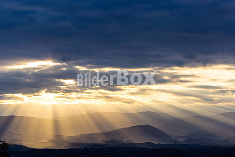 Beschreibung Sonnenstrahlen im Wolkenhimmel am Abend. Symbolfoto für Auferstehung, Kraft, Ruhe und Frieden.