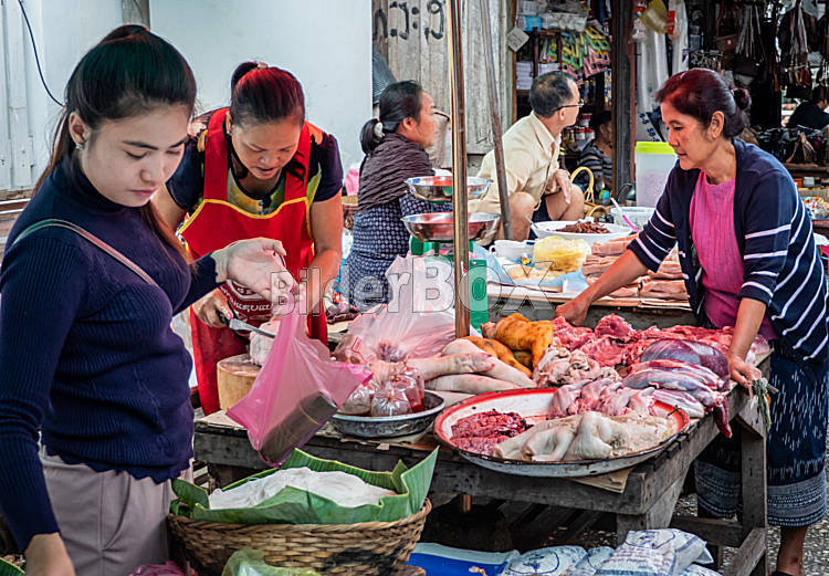 Beschreibung Luang Prabang, Laos - November 20, 2018: Fleisch wird am Markt in Luang Prabang zum Kauf angeboten.