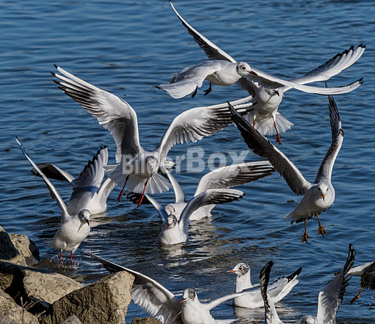 Beschreibung Möwen fliegen über einen See und suchen nach Futter