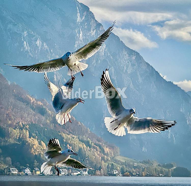 Möwen fliegen am Traunsee