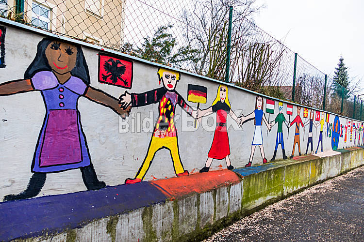 Beschreibung Auf der Mauer einer Schule haben Kinder Schüler gemalt. Symbolfoto für Miteinander und Migration