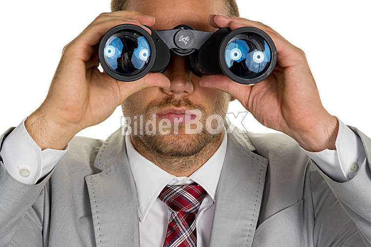 Beschreibung Ein Manager ( Jungunternehmer ) mit Fernglas auf der Suche nach Aufträgen oder Jobs