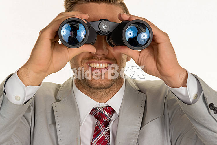 Beschreibung Ein Manager ( Jungunternehmer ) mit Fernglas auf der Suche nach Aufträgen oder Jobs