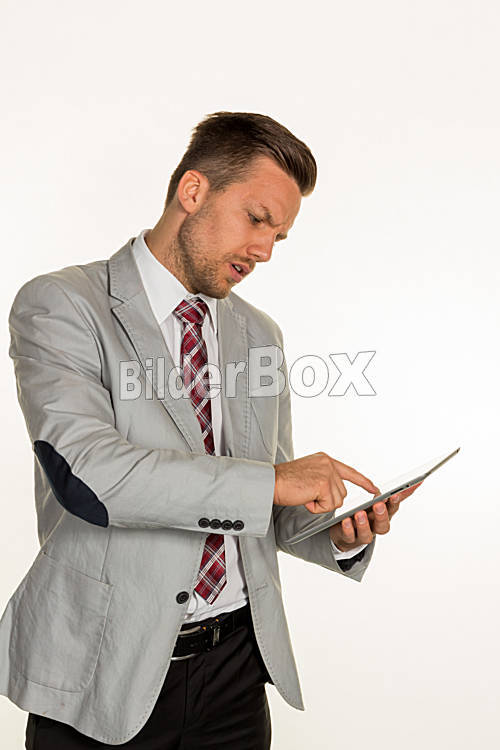 Beschreibung Ein Manager oder Unternehmer hält einen Tablet Computer in der Hand