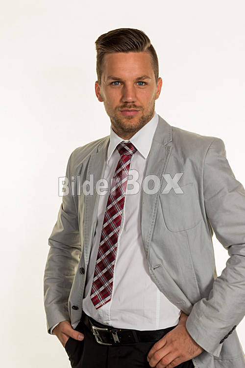Beschreibung Ein Mann ( Manager oder Unsternehmer ) steht vor einem weißen Hintergrund
