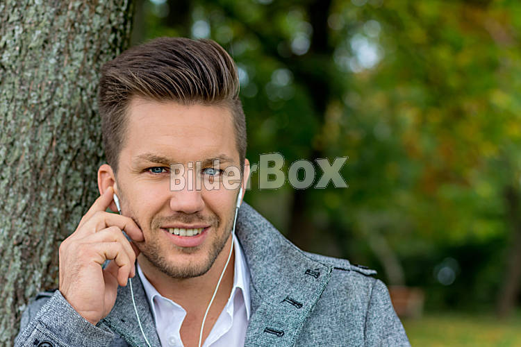 Beschreibung Ein Mann hört Musik mit Ihrem Handy. Unterhaltung am Mobiltelefon.