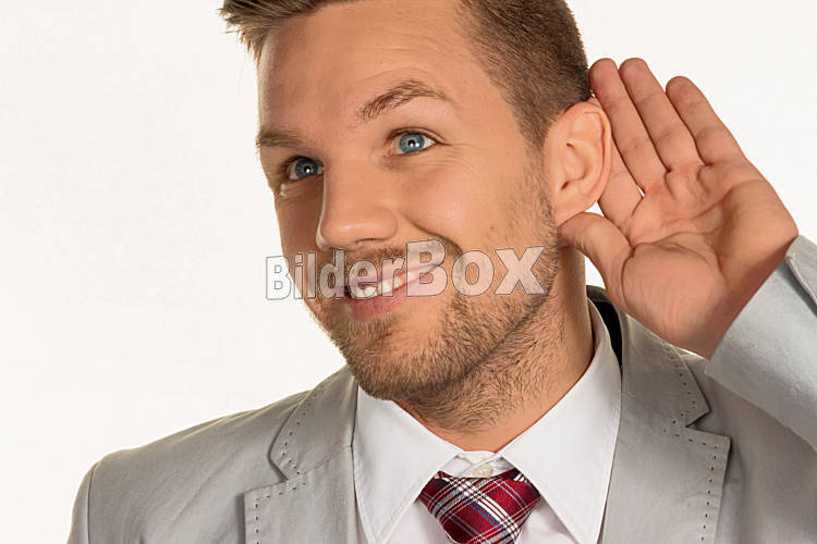 Beschreibung Ein Mann ( Unternehmer oder Manager ) hält seine Hand an sein Ohr