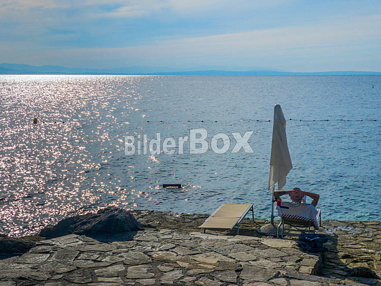 Beschreibung Ein Mann in Nachsaison auf einem Liegestuhl am Strand in Kroatien. Meer glitzert zum relaxen.