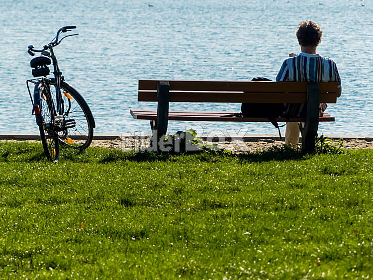 Beschreibung Ein mann sitzt nachdenklich bei einer Pause beim Radfahren auf einer Park am See