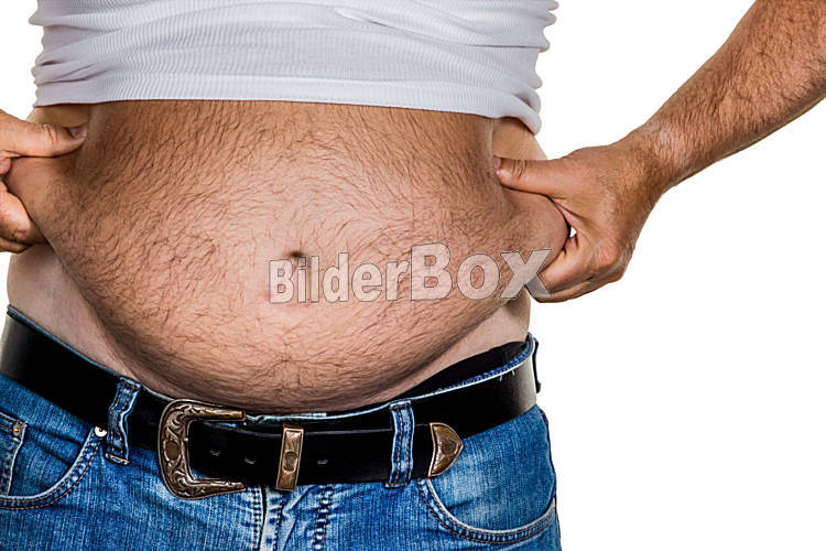 Beschreibung Mann mit Übergewicht. Symbolfoto für Bierbauch, erfolglose Diäten und falsche Ernährung.