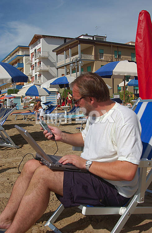 Beschreibung Mann mit Notebook Computer am Strand, Handy im Ausland - Urlaub Copyright by BilderBox.com; Erwin Wodicka, A-4062 Thening. AGBs: www.bilderbox.com/agb.html ( in an im auf als einer and und beim...