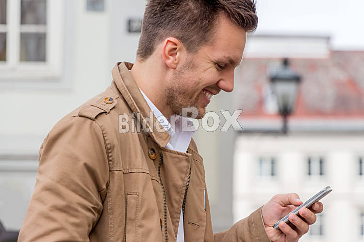 Beschreibung Ein Mann schreibt auf seinem Handy ein SMS. Kommunikation mit einem Smart phone