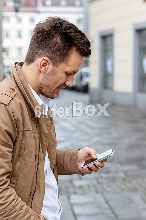 Beschreibung Ein Mann schreibt auf seinem Handy ein SMS. Kommunikation mit einem Smart phone