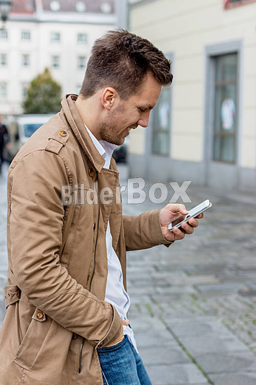 Beschreibung Ein Mann schreibt auf seinem Handy ein SMS. Kommunikation mit einem Smart phone