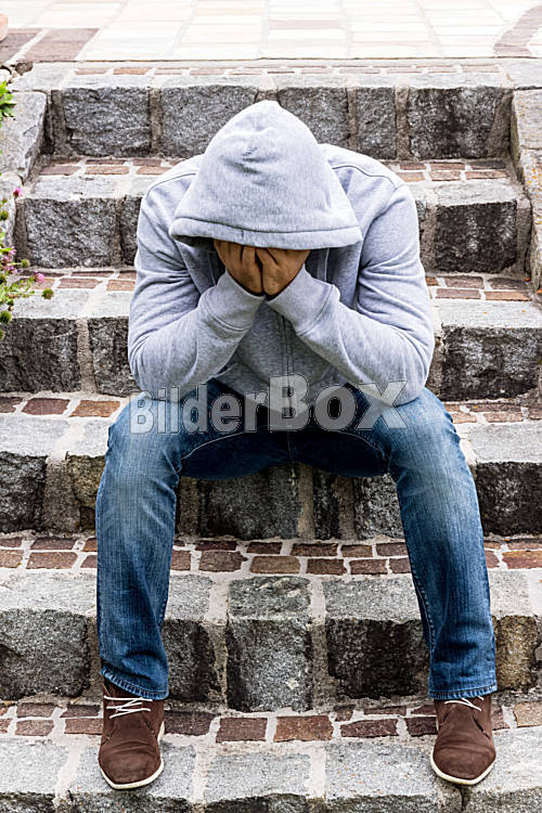 Beschreibung Ein Mann sitzt einsam auf Stufen