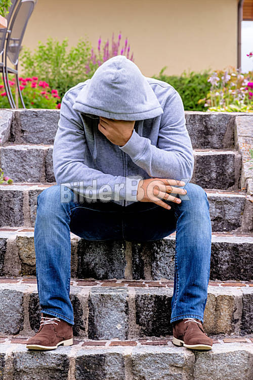 Beschreibung Ein Mann sitzt einsam auf Stufen