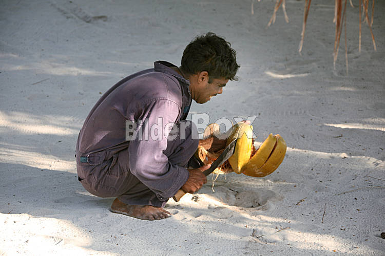 Beschreibung Mann zerkleinert Kokosnuss [ NUR FUER REDAKTIONELLE VERWENDUNG! NO MODEL-RELEASE! NUR POSITIVE TEXTE! (c) www.BilderBox.com, Erwin Wodicka, Siedlerzeile 3, A-4062 Thening, Tel. + 43 676...