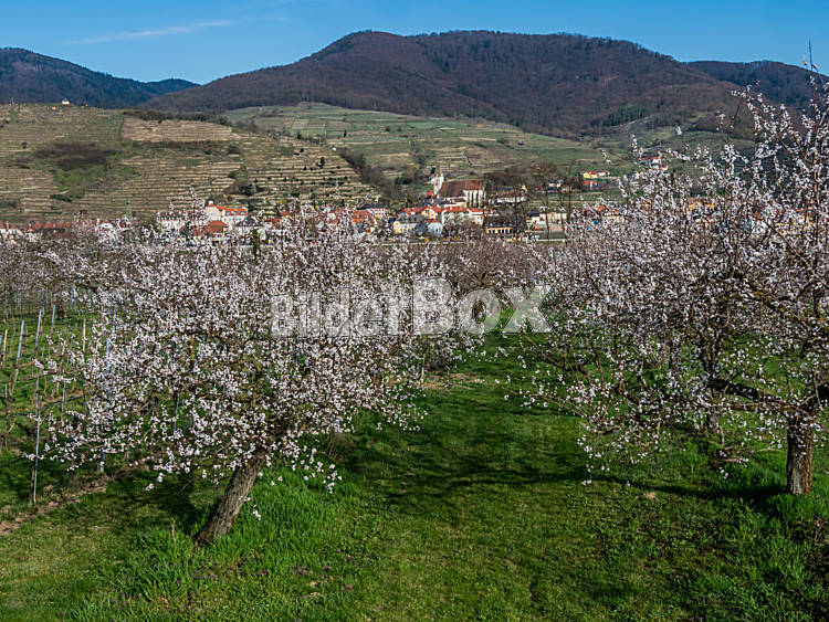 Beschreibung Marillenblüte (Aprikosenblüte) in der Wachau (Weltkulturerbe), Österreich, Ca. 2 Wochen lang blühen im Frühling die Marillenbäume. Hier der Ort Spitz