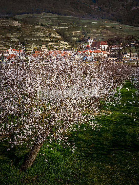 Beschreibung Marillenblüte (Aprikosenblüte) in der Wachau (Weltkulturerbe), Österreich, Ca. 2 Wochen lang blühen im Frühling die Marillenbäume. Hier der Ort Spitz