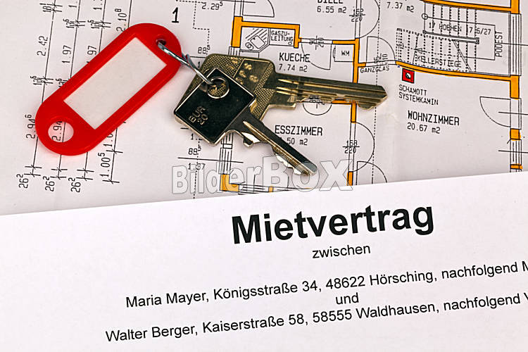 Beschreibung Ein Mietvertrag und ein Bauplan in deutscher Sprache. Symbolbild Miete oder Kauf von Wohnungen