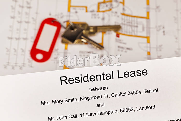 Beschreibung Ein Mietvertrag und ein Bauplan in englischer Sprache. Symbolbild Miete oder Kauf von Wohnungen