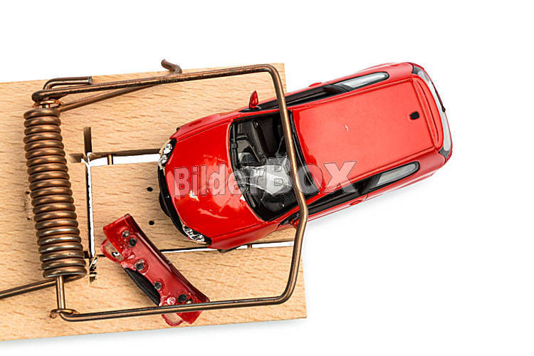 Beschreibung Ein Modellauto in einer Mausefalle, Symbolfoto für Autokosten und Schulden