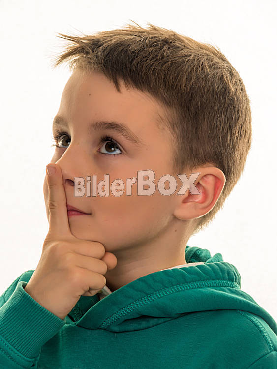 Beschreibung Ein Bub denkt nach. Nachdenkliches oder neugieriges Kind.