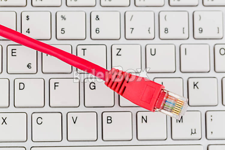 Beschreibung Netzwerkkabel auf Tastatur, Symbolfoto für Flatrate, E-Commerce, globale Kommunikation