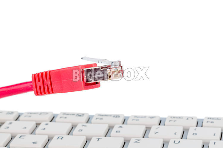 Beschreibung Netzwerkkabel auf Tastatur, Symbolfoto für Flatrate, E-Commerce, globale Kommunikation
