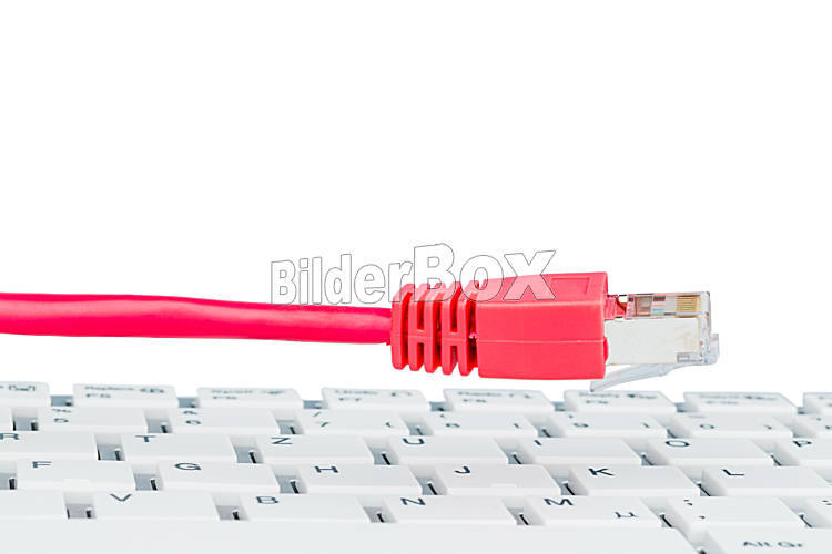 Beschreibung Netzwerkkabel auf Tastatur, Symbolfoto für Flatrate, E-Commerce, globale Kommunikation